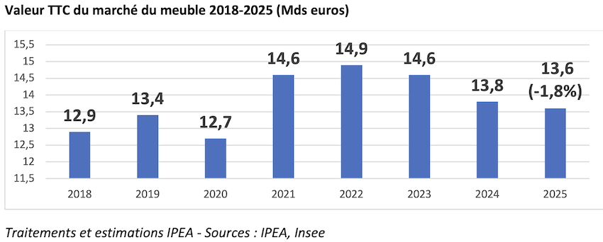 Néanmoins, il convient de nuancer ce constat. En effet, les résultats enregistrés par la filière l’an passé font certes état d’un recul de 1,8 % (13,6 Md€ TTC) ; mais celui-ci est tout de même de moindre importance que lors des crus précédents (- 5,1 % en 2024 et -2,5 % en 2023). De fait, la CNEF, l’Ameublement français et l’IPEA, qui ont dévoilé lesdits résultats à la presse le mardi 3 février, parlent à juste titre de résilience et évoquent plusieurs éléments encourageants :