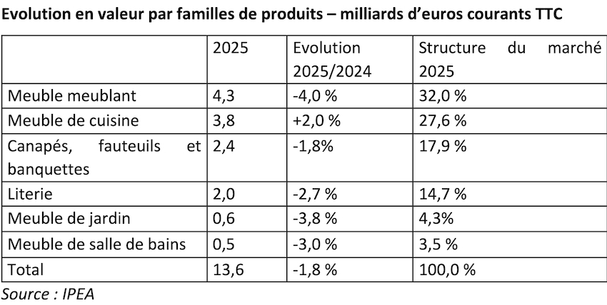 Dévoilés ce mardi 3 février par la CNEF (Confédération nationale de l’équipement du foyer), l’Ameublement français et l’IPEA (Institut de prospective et d’études de l’ameublement), les résultats enregistrés par le marché français du meuble l’an passé font état d’un repli de 1,8 % (13,6 Md€ TTC). La filière signe donc un troisième exercice d’affilée en recul… même si ce dernier est, en 2025, de moindre importance que lors des crus précédents (- 5,1 % en 2024 et -2,5 % en 2023) et témoigne, compte tenu du contexte chahuté, d'une résilience certaine. Autre fait important à constater, toutes les familles de produits ont terminé l’année en baisse… à l’exception de la cuisine intégrée, qui est la seule à afficher un résultat positif (+ 2%, soit 3,8 Md€ TTC) ; une croissance portée d’ailleurs en grande partie par les spécialistes cuisine, dont les résultats sont certes hétérogènes en fonction des acteurs mais qui, dans leur ensemble, progressent de 4,6 % ! Décryptage.